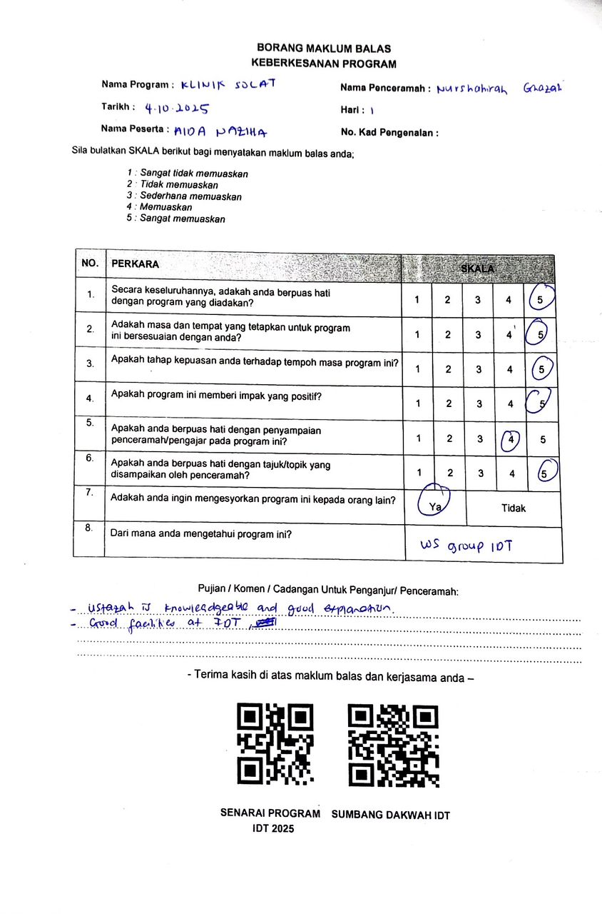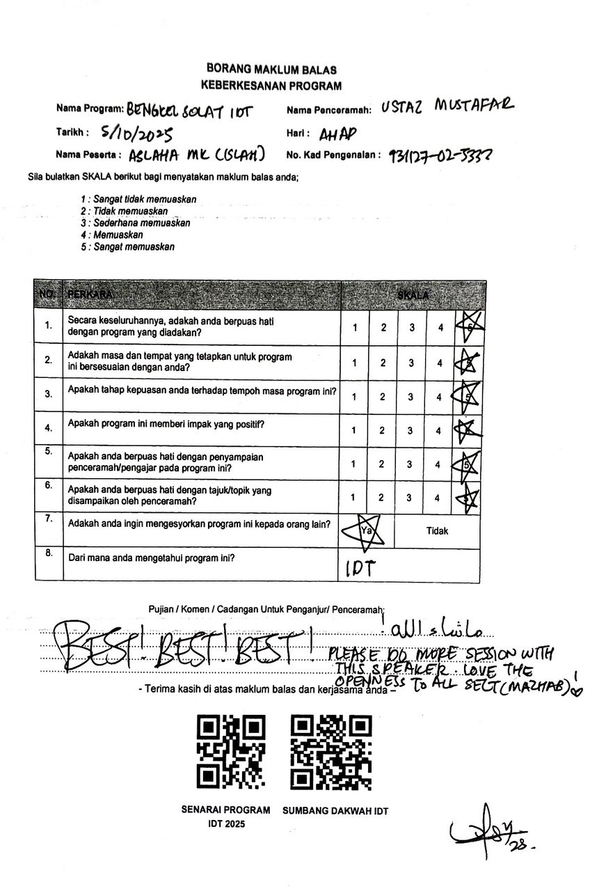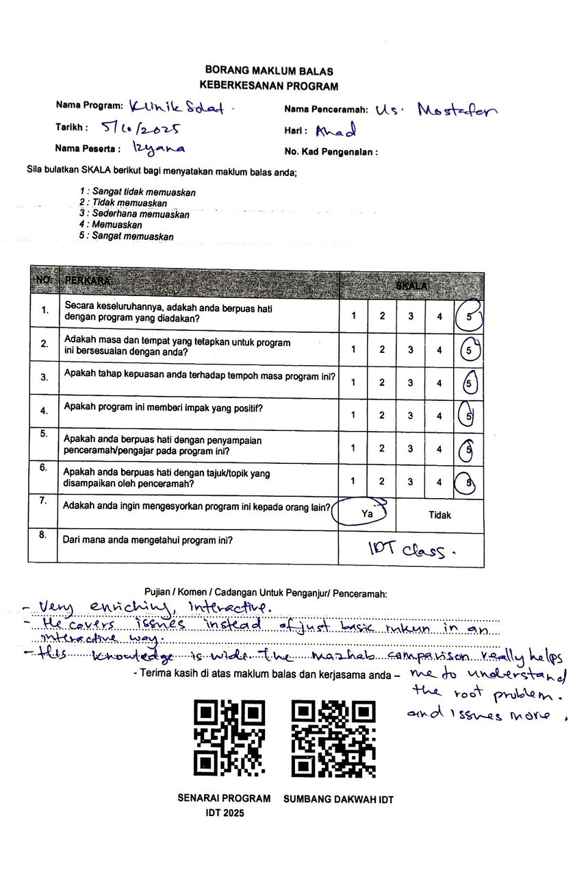 The program closed on a thoughtful note as participants shared what they had gained. Many realised that Klinik Solat was not merely about learning the steps of prayer, but about rediscovering its purpose. Each person left with a quiet determination to make their salah more mindful and sincere. IDT hopes that the lessons learned will nurture more khushu‘, understanding, and peace in every salah. The participants also shared encouraging feedback, expressing how the sessions helped them improve their understanding and confidence in performing prayer.